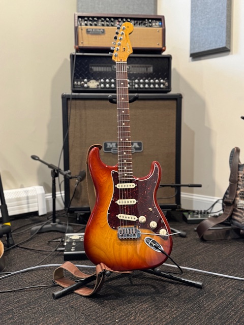 I used my mutt partscaster, a 2013 American Deluxe neck with a rosewood fretboard and a 2014 60th Anniversary Siennaburst ash body, with a set of Suhr V60LPs, for all of my Stratocaster rhythm parts. A lot of these songs will ultimately have a Strat playing the leads, so I wanted to have it sit in a slightly different space than my ’97 maple fretboard/alder bodied American Standard. The one song I will be using this on leads, it’s a power trio arrangement with no rhythm guitar, so that won’t be an issue either.