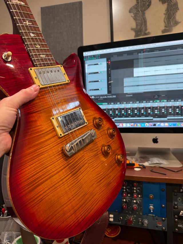 I won’t go deep into my arrangement philosophy here, but I’ve always loved the… let’s call it “augmentation” part of the songwriting process, where you have a song hashed out more or less in full, but there’s still room to go back and come up with tiny little supporting parts to add to it and fill things out a little. Doing that is a lot of fun, but you also have to be careful to make sure that nothing you do gets in the way of what makes the song “work,” and whatever the focus of the song is, the “hook” that’s driving your arrangement, be it a cool bassline, or a guitar or vocal melody, or a strummed chordal part… whatever you’re doing is supporting that and augmenting it, but not really taking attention away from it in any way. Here, I think part of that is if you’re adding a line that’s already in the same register as the lead melody, even panned out of the center, you really need to keep the dynamic “energy” of the part sitting well behind the hook. Here, I started with the Strat, could immediately tell it wasn’t going to sit right, and basically just copied the same FX chain into a new track then overdubbed the same part with (ultimately, after trying both pickups) the neck position of my PRS, and even when I then bypassed a compressor that no longer felt like it was needed, the part “glued” into the lead line, rather than jumped out over it.