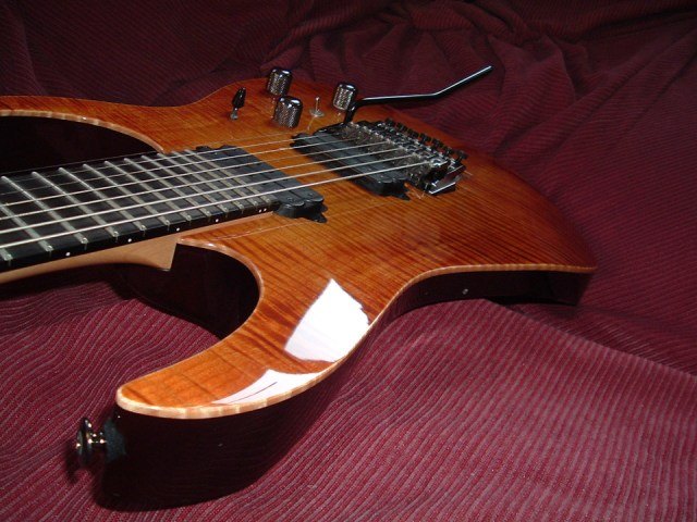 This was an early J-Custom, Ibanez’s Japanese small run production line; mahogany body. flamed maple top, ebony fretboard, “vintage violin” finish which didn’t actually inspire the choice of Bengal Burst on my Suhr but probably didn’t hurt, custom-wound Dimarzio pickups, and an Ibanez “Double Edge” seven string trem, with piezo pickups under the saddles. Normally the piezos and the magnetic pickups had seperate outputs, but while my memory is a little fuzzy, this one almost certainly had the KJG wiring mod to allow you to blend both, by virtue of the fact the seller was a friend of Kevan’s and he helped broker the deal.