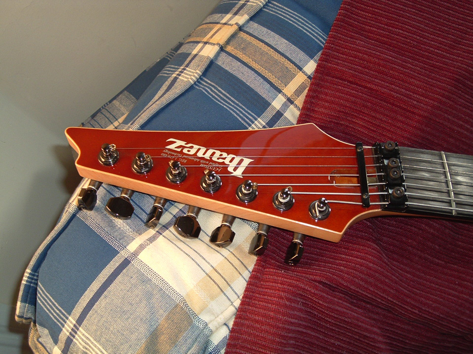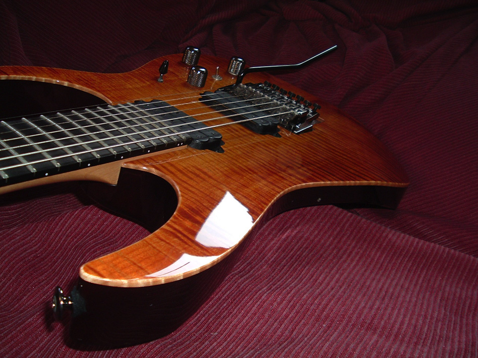 This was an early J-Custom, Ibanez’s Japanese small run production line; mahogany body. flamed maple top, ebony fretboard, “vintage violin” finish which didn’t actually inspire the choice of Bengal Burst on my Suhr but probably didn’t hurt, custom-wound Dimarzio pickups, and an Ibanez “Double Edge” seven string trem, with piezo pickups under the saddles. Normally the piezos and the magnetic pickups had seperate outputs, but while my memory is a little fuzzy, this one almost certainly had the KJG wiring mod to allow you to blend both, by virtue of the fact the seller was a friend of Kevan’s and he helped broker the deal.